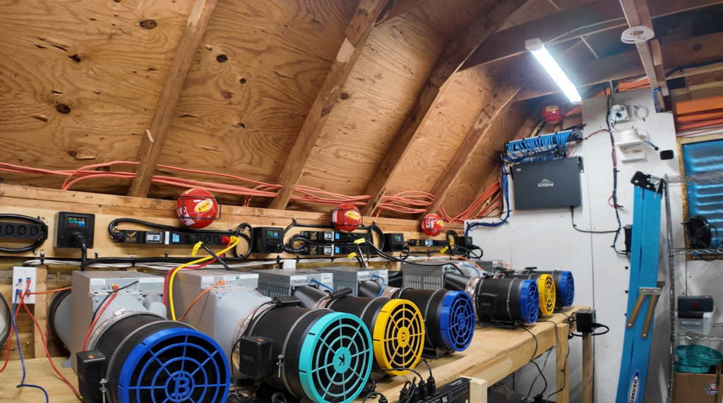 - Shed Setup: The home crypto mining shed is packed with miners top and bottom, some holes in the exhaust wall for recirculating heat (pulling in below-freezing air, outputting 45°F).