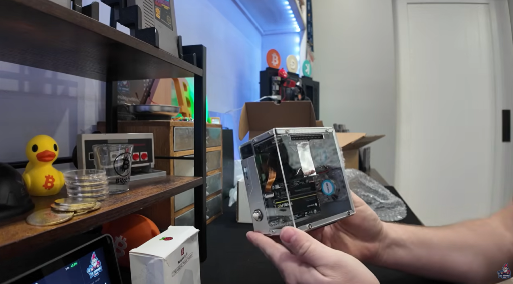 The RGB fans spin up, lighting the box in that signature Bitcoin Merch fashion. It’s honestly a little show in itself—totally fits on a shelf next to your other gear (or even behind you, just because it looks that good).
