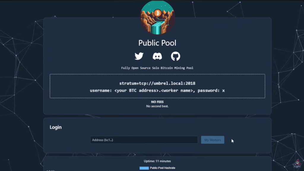 - The pool will display its listening address—usually something like stratum+tcp://umbrel.local:2018 (use your node’s actual internal IP if you’re running multiple nodes).
